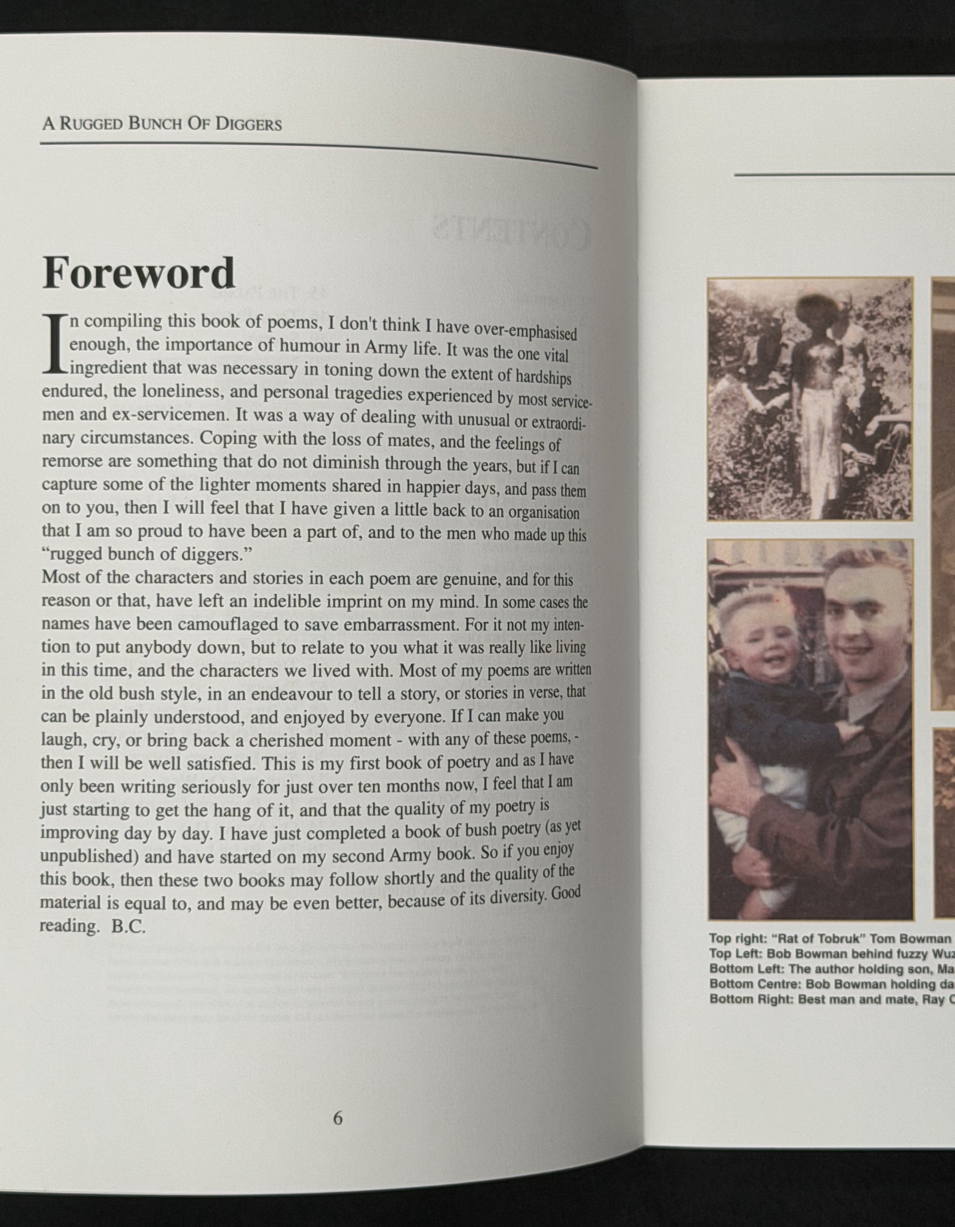 "A Rugged Bunch of Diggers" is a collection of poems by Bill Charlton, written in an accessible, bush style. The poems recount stories and characters from army life, particularly experiences of Australian servicemen. Charlton aims to capture both the hardships and the humour of military life, offering insights into the camaraderie, coping mechanisms, and emotional impact of service. The book covers themes of mateship, loss, and the lighter moments shared by soldiers, seeking to resonate with anyone who has experienced army life or appreciates storytelling in verse. The author hopes to evoke laughter, tears, and cherished memories for the reader.