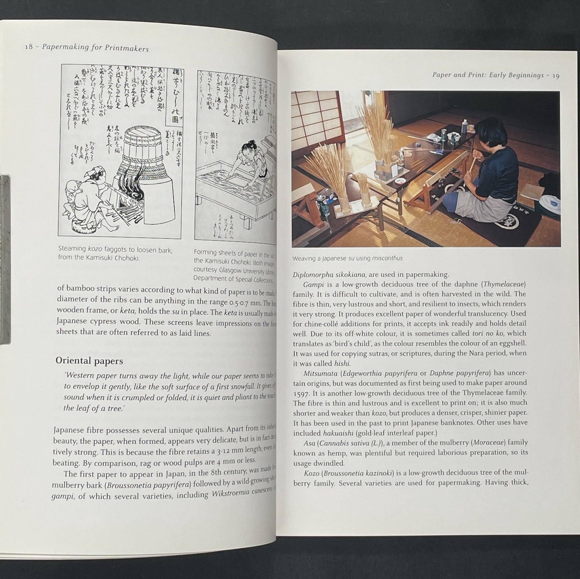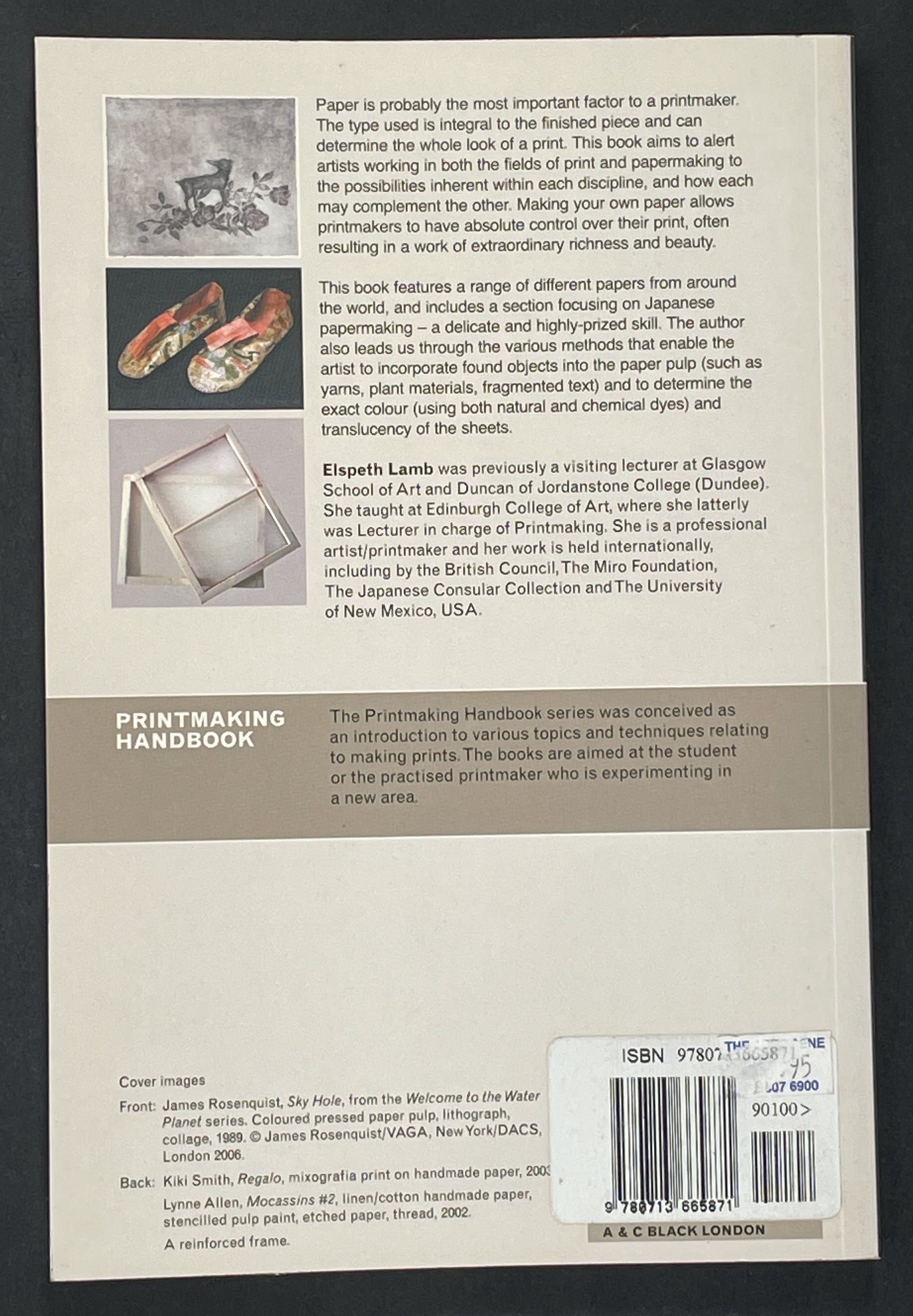 This handbook is aimed at printmakers and artists keen to explore the combined potential of printmaking and papermaking. It provides an introduction to the art of papermaking, guiding the reader through setting up a workspace and creating a simple Western-style mould and deckle. The book examines various papermaking techniques, including pulp painting, watermarks, and using native Scottish plants.