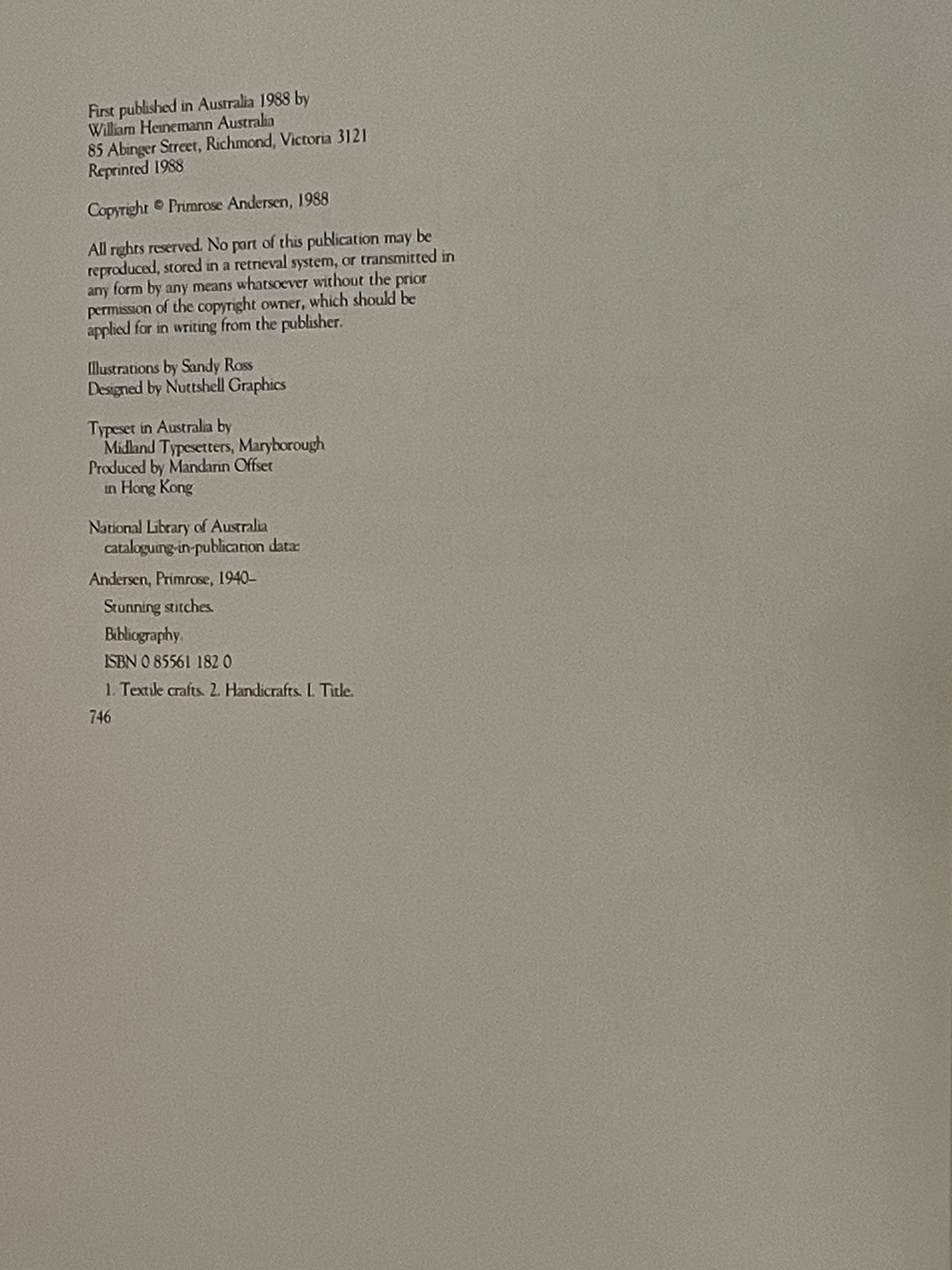 "Stunning Stitches" is a comprehensive guide to embroidery, crafted for both beginners and experienced needleworkers. Primrose Andersen shares 20 original patterns, spanning a variety of stitches and techniques, some traditional and others revived.