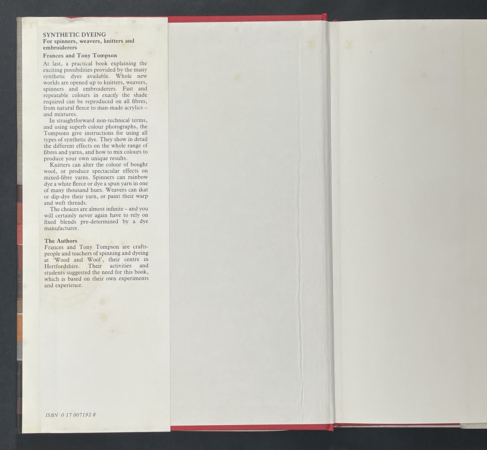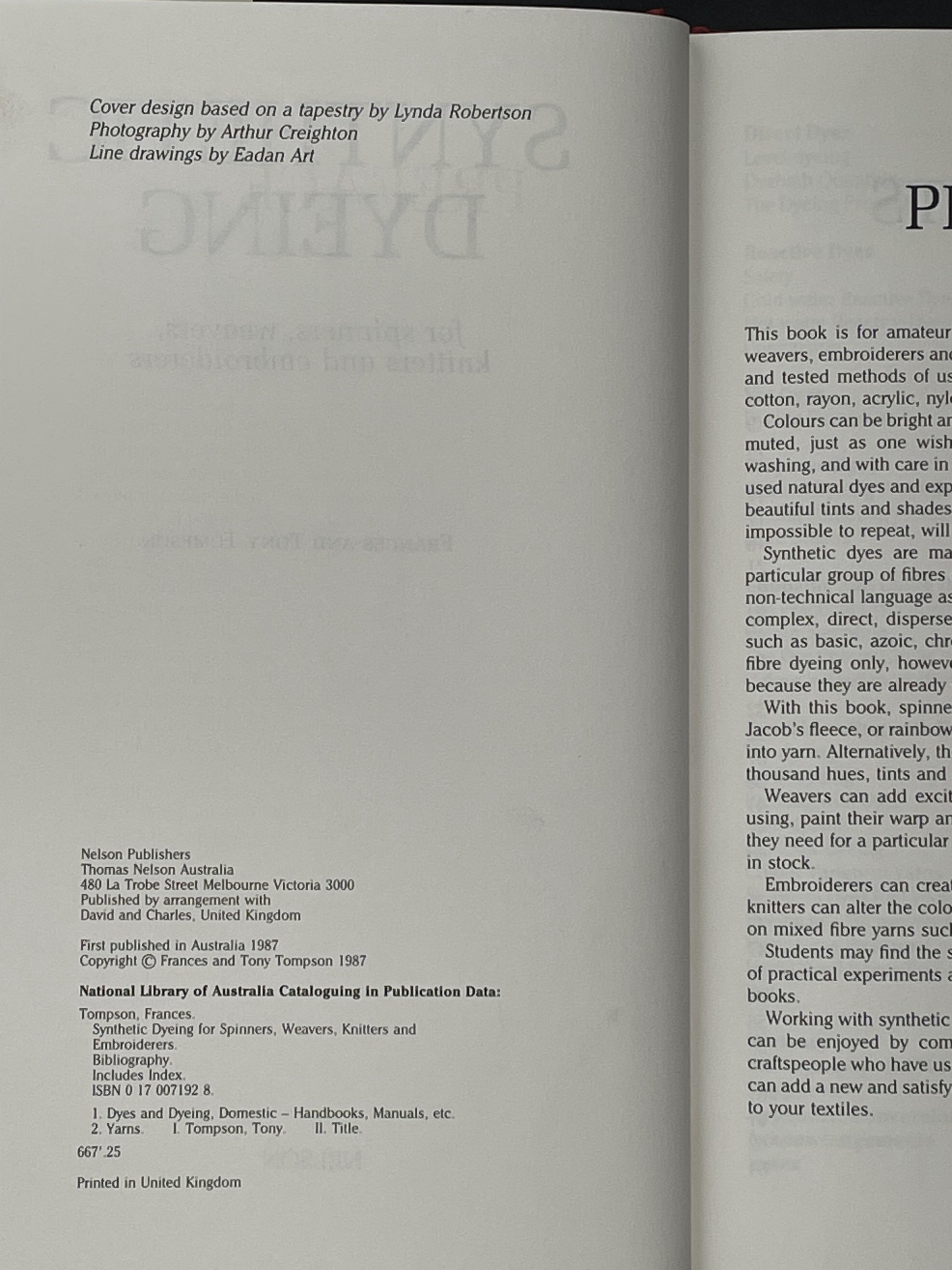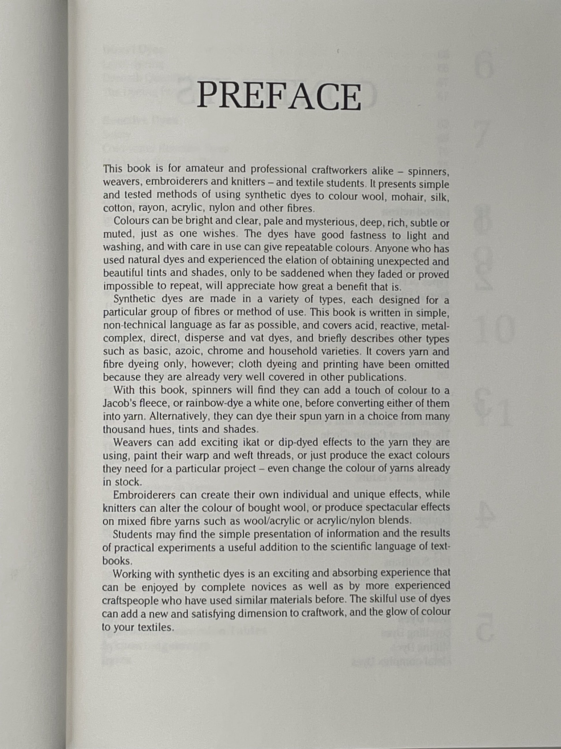 This book is a guide for craftworkers wishing to employ synthetic dyes on fibres and yarns. It presents simple, tested methods for dyeing wool, mohair, silk, cotton, rayon, acrylic, nylon, and other fibres. It explains how to achieve bright, clear, subtle or muted colours that are fast to light and washing.