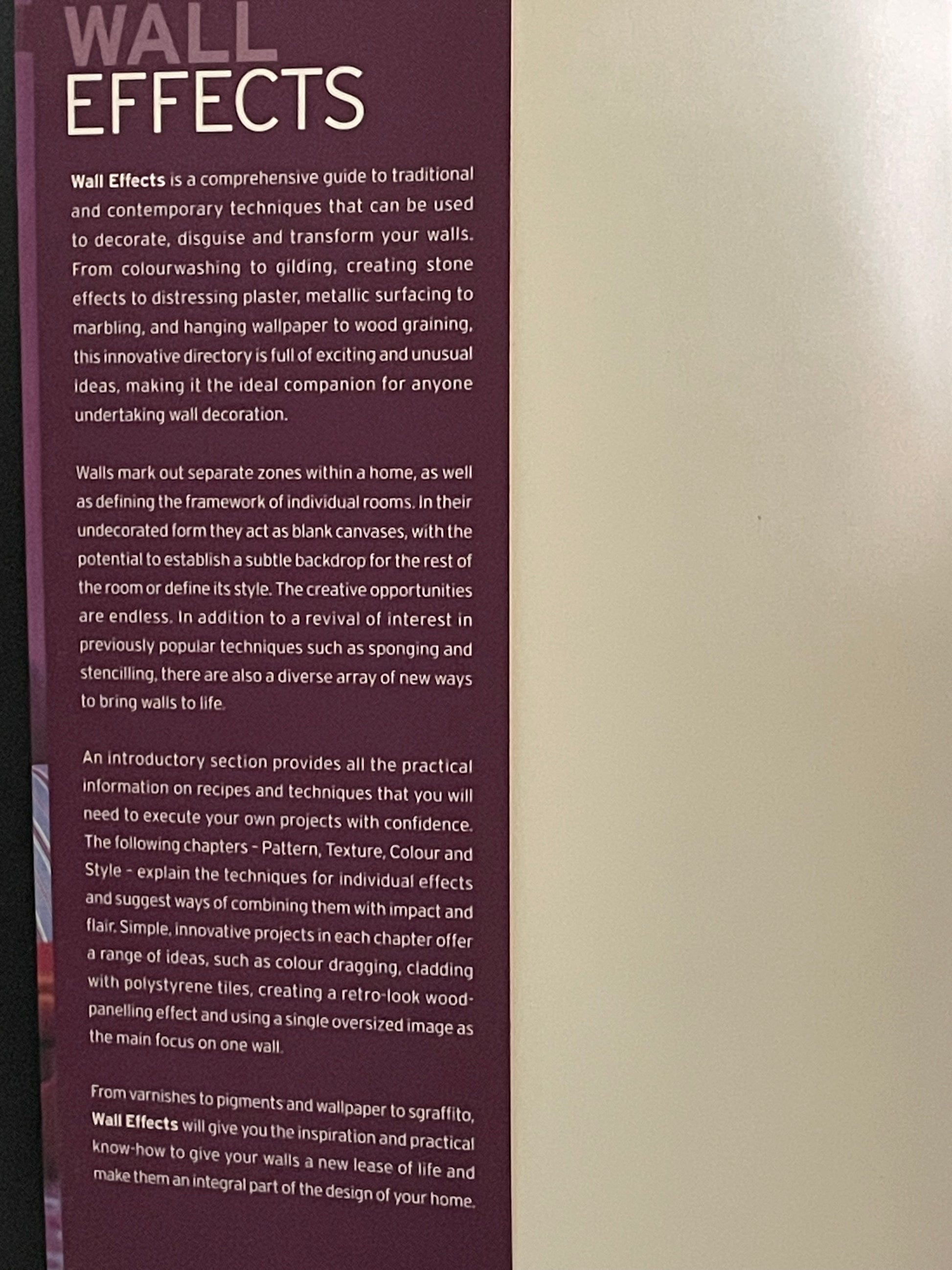"Wall Effects" by Katie Ebben provides a comprehensive exploration of both traditional and contemporary wall decoration techniques. It showcases exciting and unusual approaches to transform walls, covering a wide range of effects from colourwashing and gilding to stone effects, metallic surfacing, and even wood graining.
