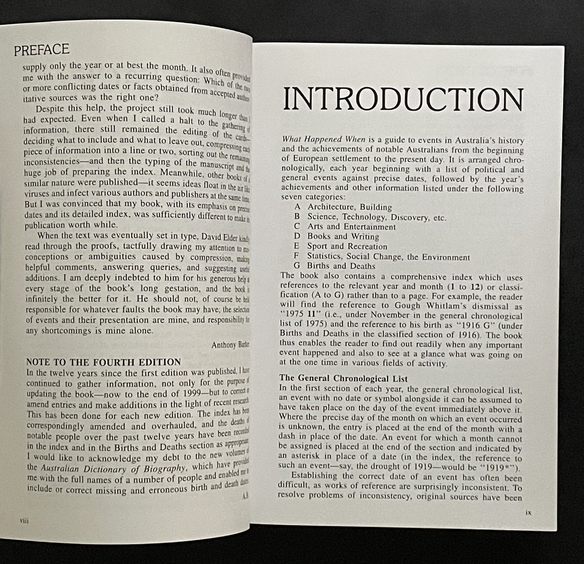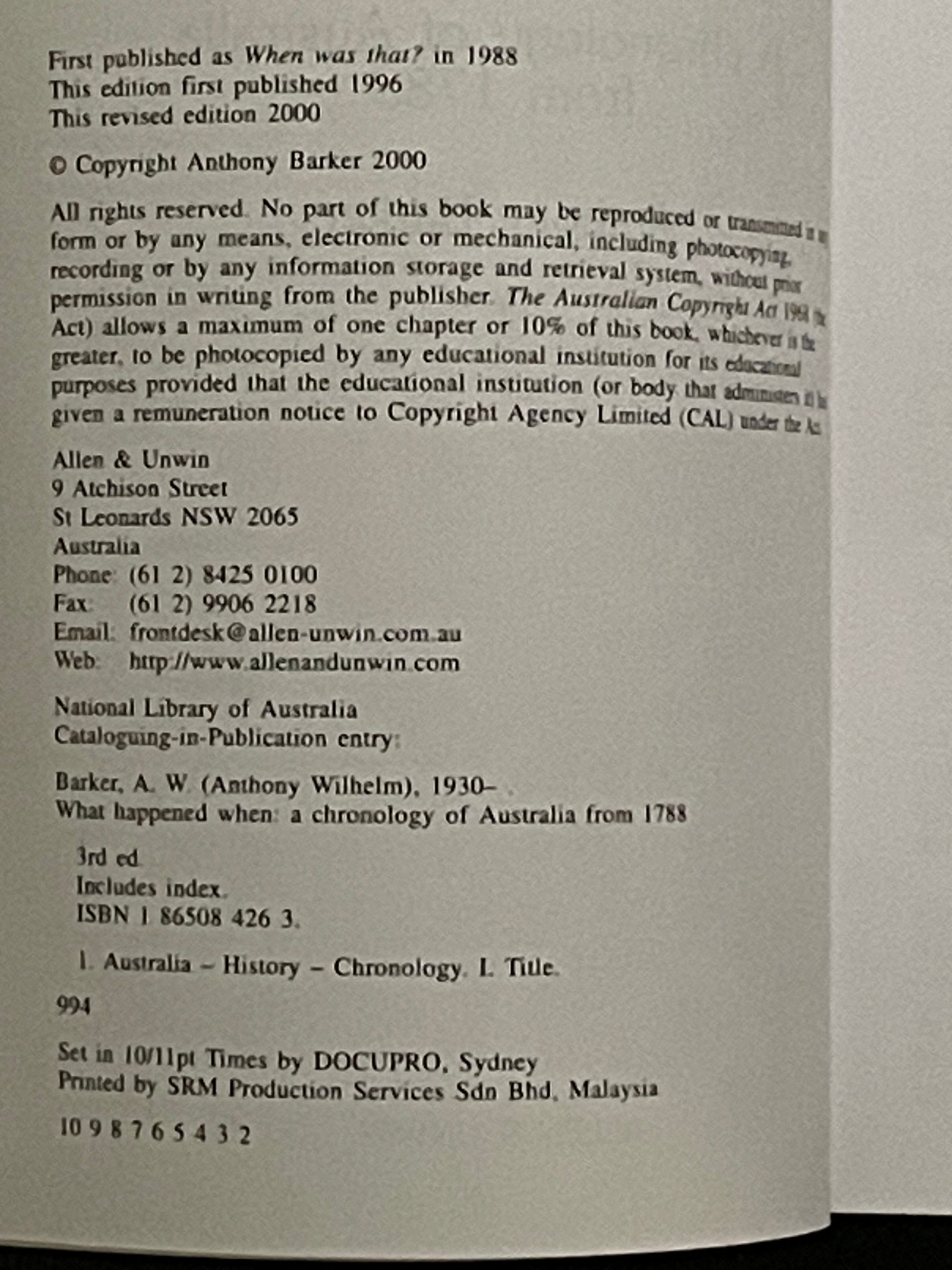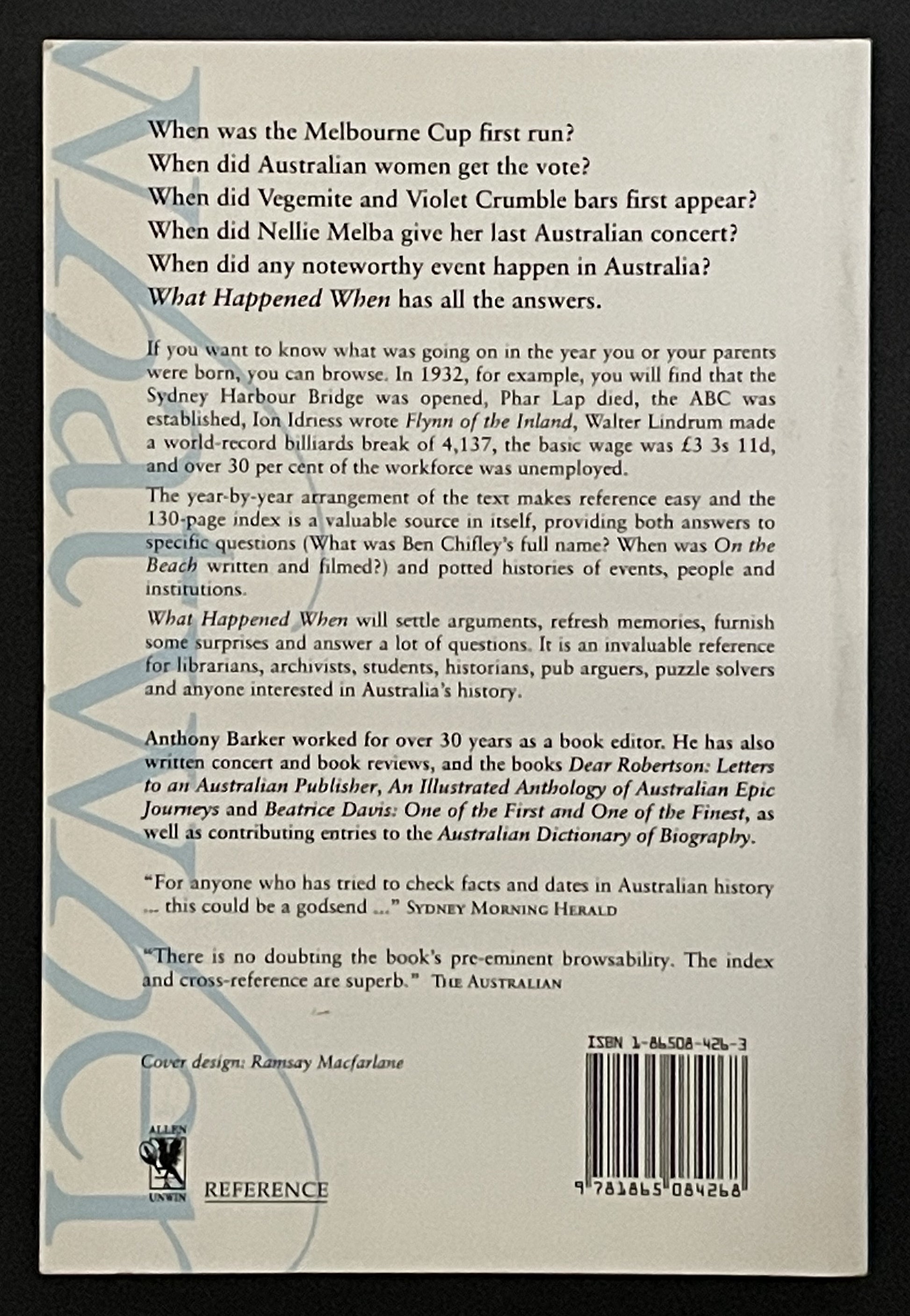 *What Happened When* is a comprehensive chronology of Australia from 1788 onwards. Anthony Barker meticulously compiles a year-by-year record of significant events, achievements, and noteworthy happenings across various fields, from politics and architecture to the arts and sciences.